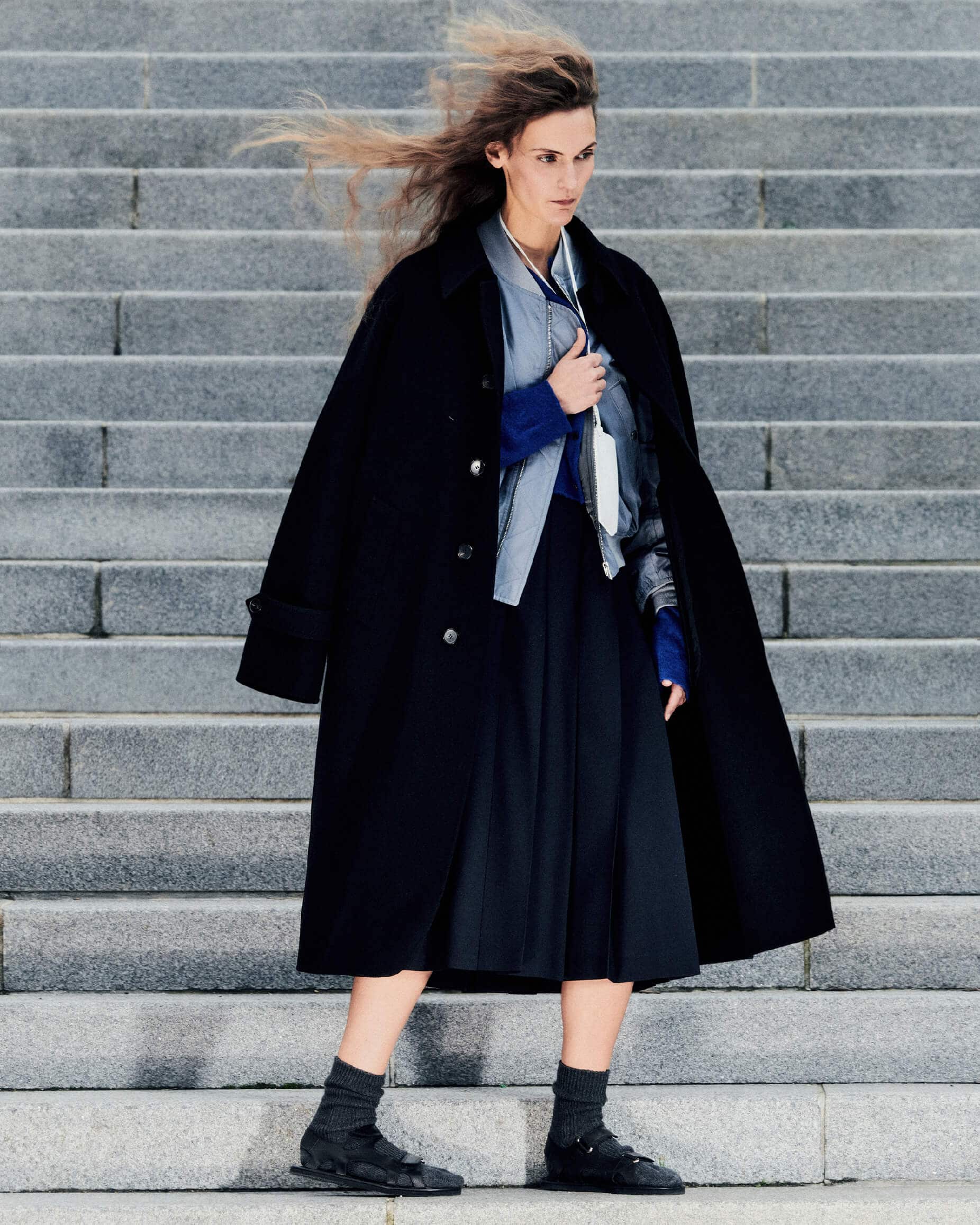 Fia wears Super Fine Wool Melton Hand Sewn Coat in Black, High Density Silk Twill Flight Blouson in Blue Gray, Wool Kid Mohair Hopsack Pleated Skirt in Dark Navy, Brushed Cashmere Cotton Knit Cardigan in Royal Blue, Leather Sunglasses Case in White, Cotton Cashmere Low Gauge Socks in Top Charcoal, Soft Leather Double Strap Sandals in Black