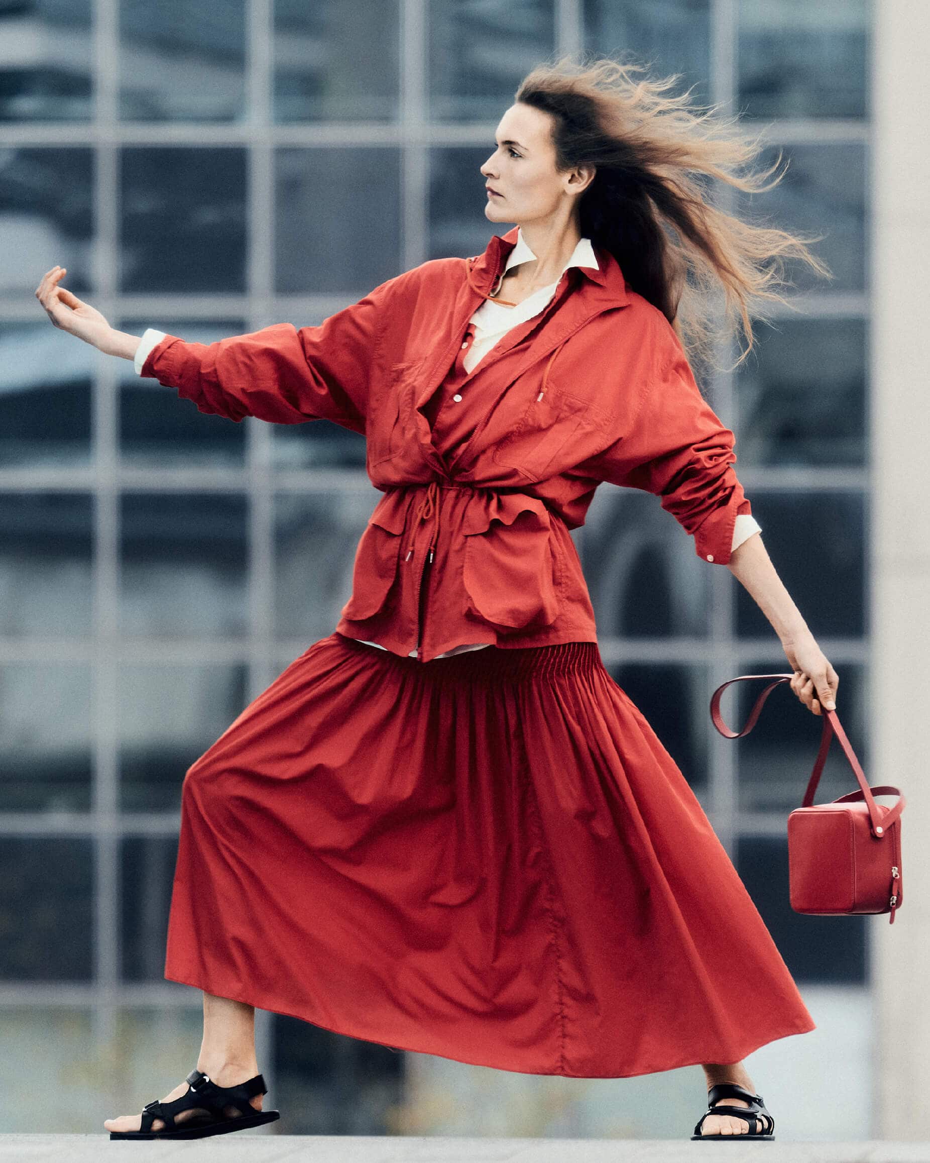 Fia wears Super Fine Cotton Lawn Hooded Blouson in Red, Super Fine Cotton Lawn Shirt in Red, Super Fine Cotton Lawn Shirt in Ivory White, Super Fine Cotton Lawn Pin-Tuck Skirt in Red, Soft Leather Double Strap Sandals in Black, Leather Shoulder Bag Made by Aeta in Red
