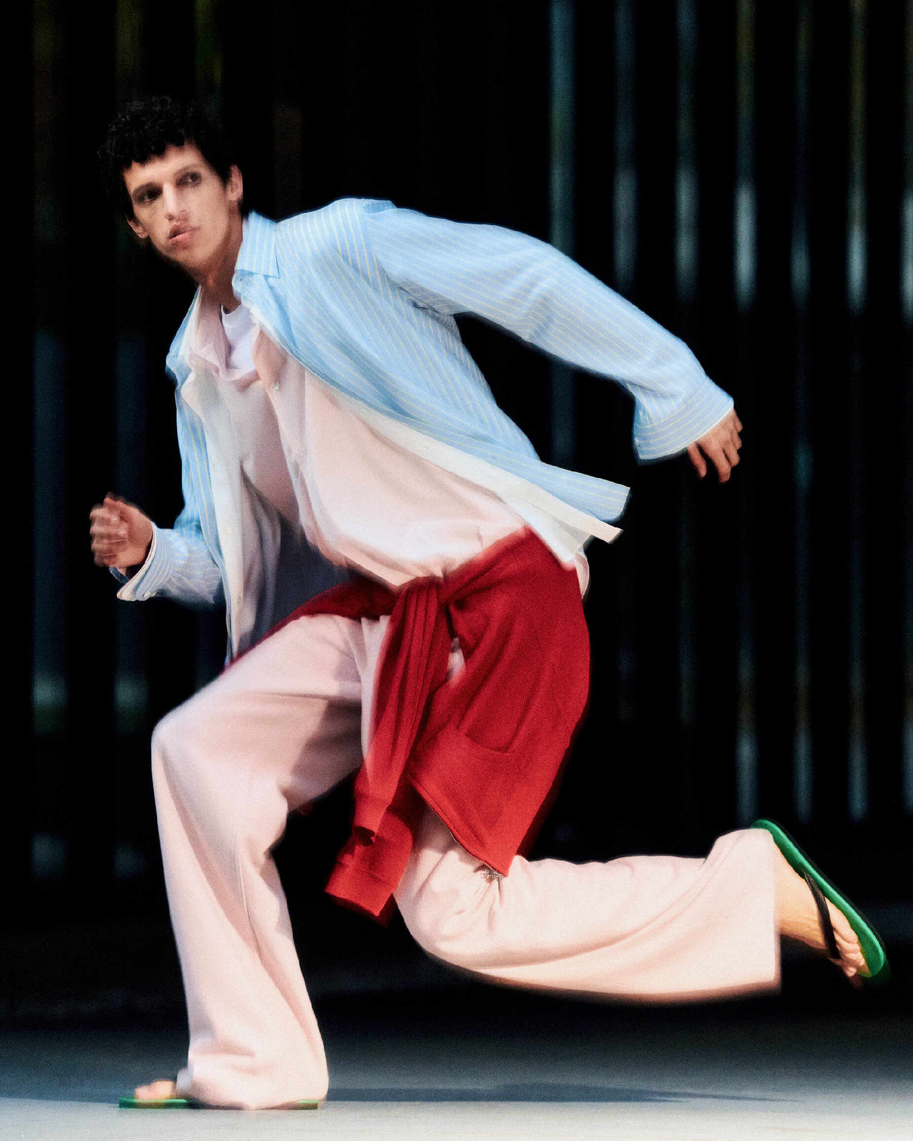 Nour wears Super Fine Wool Stripe Shirt in Sax Blue Stripe, Washed Finx Twill Slim Shirt in White, Washed Finx Weather Chambray Shirt in Pink Beige, Silk Nep Denim 5p Wide Pants in Dusty Pink, High Twist Light Sweat Zip Parka in Red, Soft Leather Flip-Flops in Green x Black