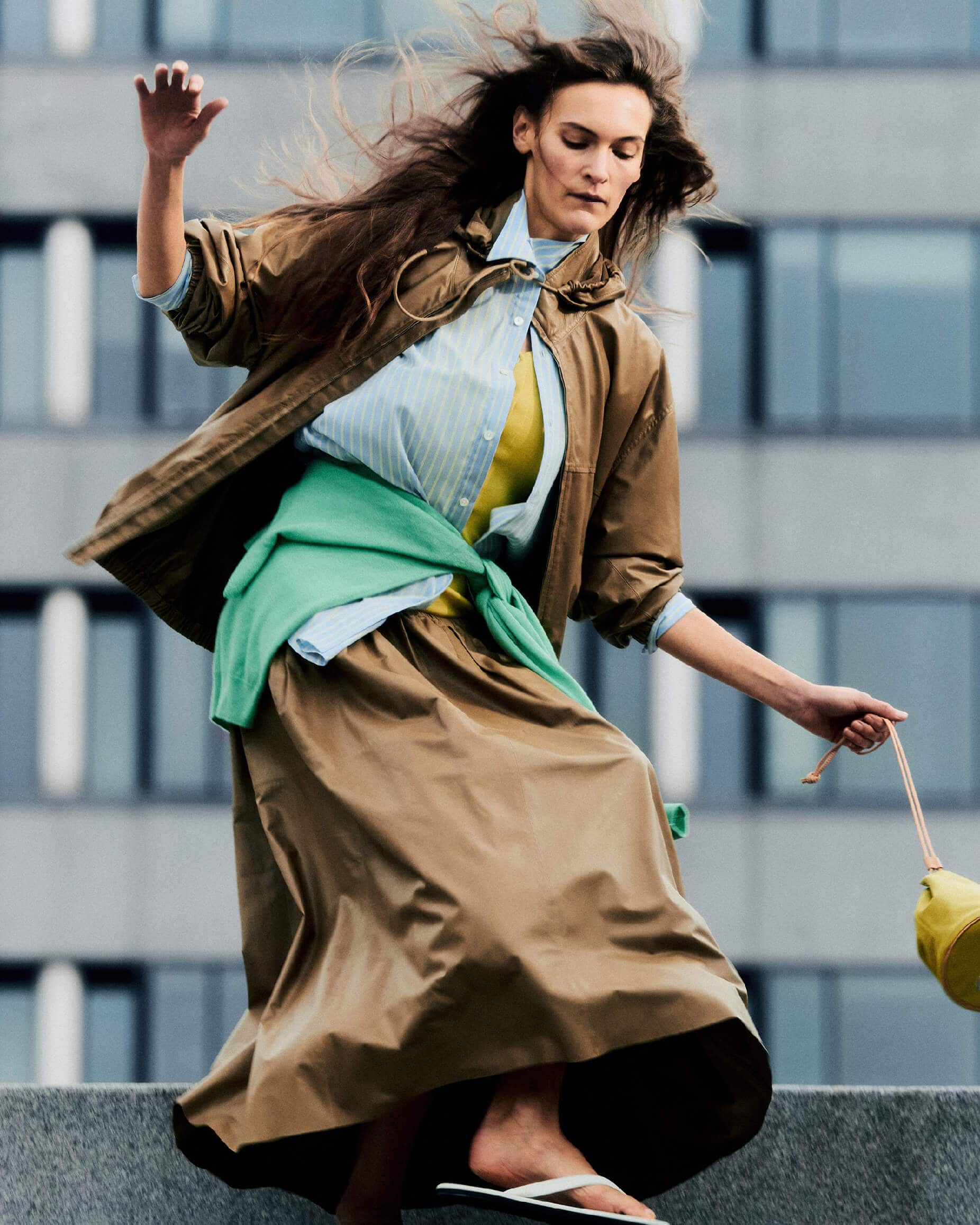 Fia wears Fine Baby Calf Hooded Blouson in Khaki Beige, Fine Baby Calf Gather Skirt in Khaki Beige, Super Fine Wool Stripe Shirt in Sax Blue Lime Stripe, Wool Stretch Double Jersey Tank in Lime Yellow, Super Fine Cashmere Silk Knit Skipper Polo in Mint Green, Cordura Nylon Small Shoulder Bag Made by Aeta in Lime Yellow, Soft Leather Flip-Flops in White