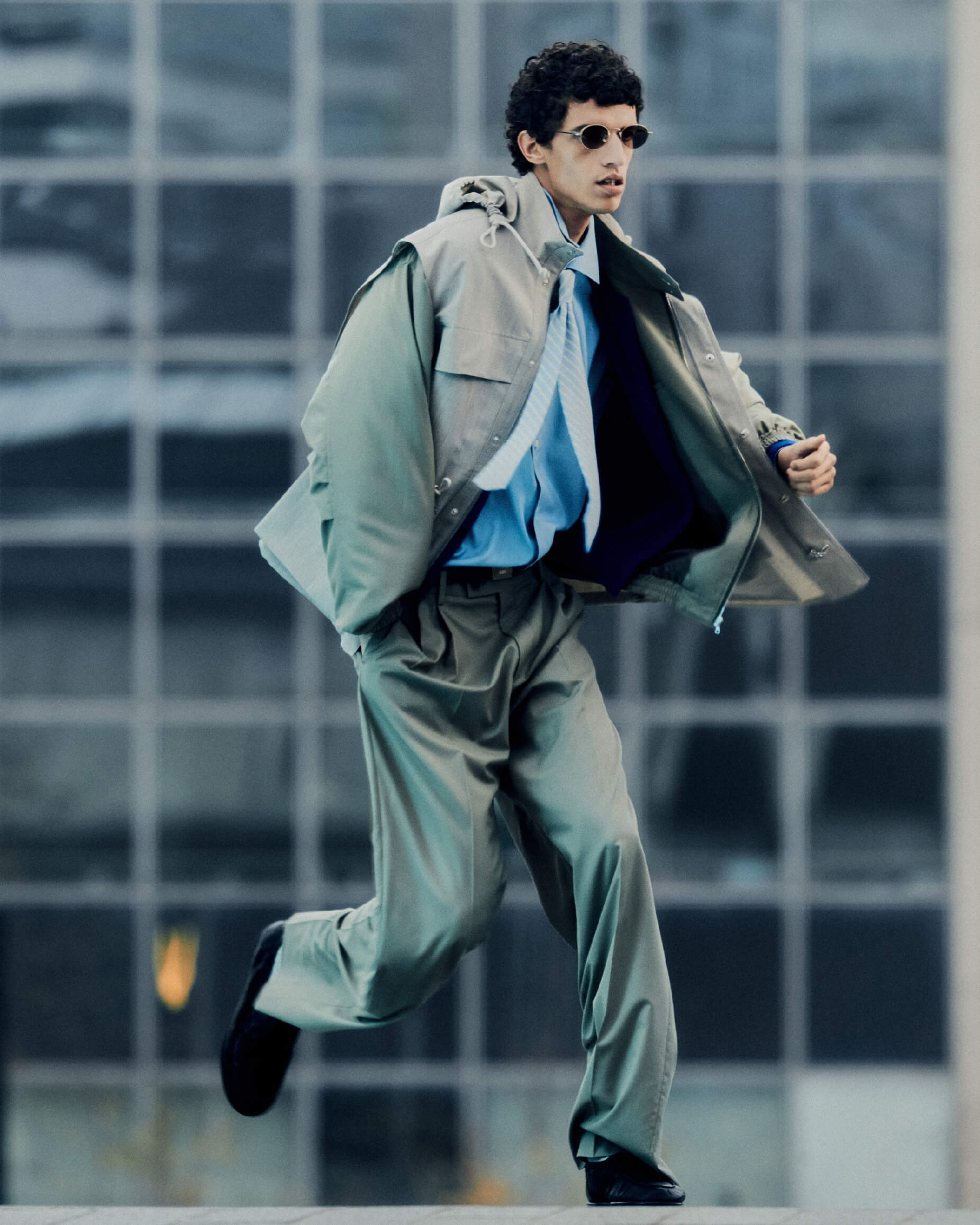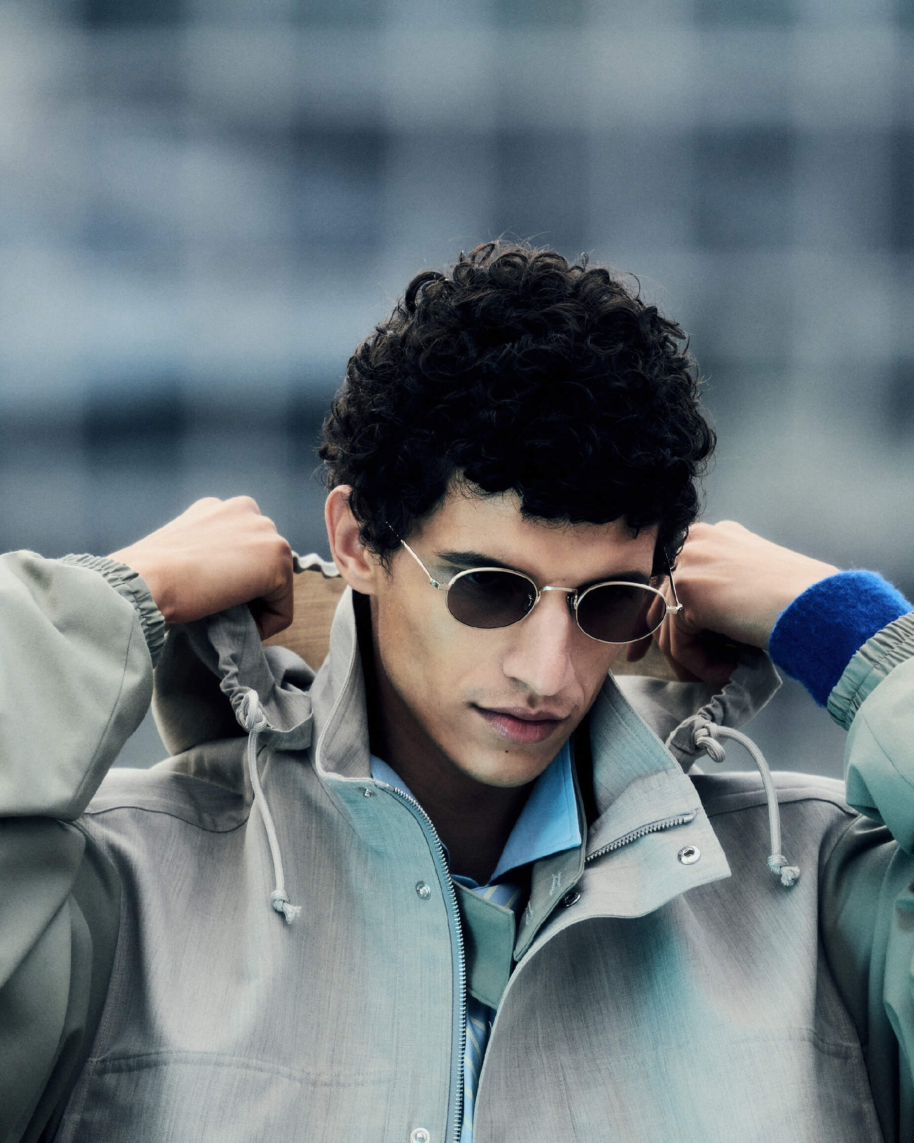 Nour wears Ultra Fine Tropical Wool Zip Blouson in Light Khaki, Ultra Fine Tropical Wool Two-Tuck Slacks in Light Khaki, Wool Max Canvas Over Vest in Top Gray Beige, Washed Finx Twill Slim Shirt In Light Blue, Brushed Cashmere Cotton Knit Cardigan in Royal Blue, Sunglasses 003 in Antique Gold, Soft Leather Deck Shoes in Black