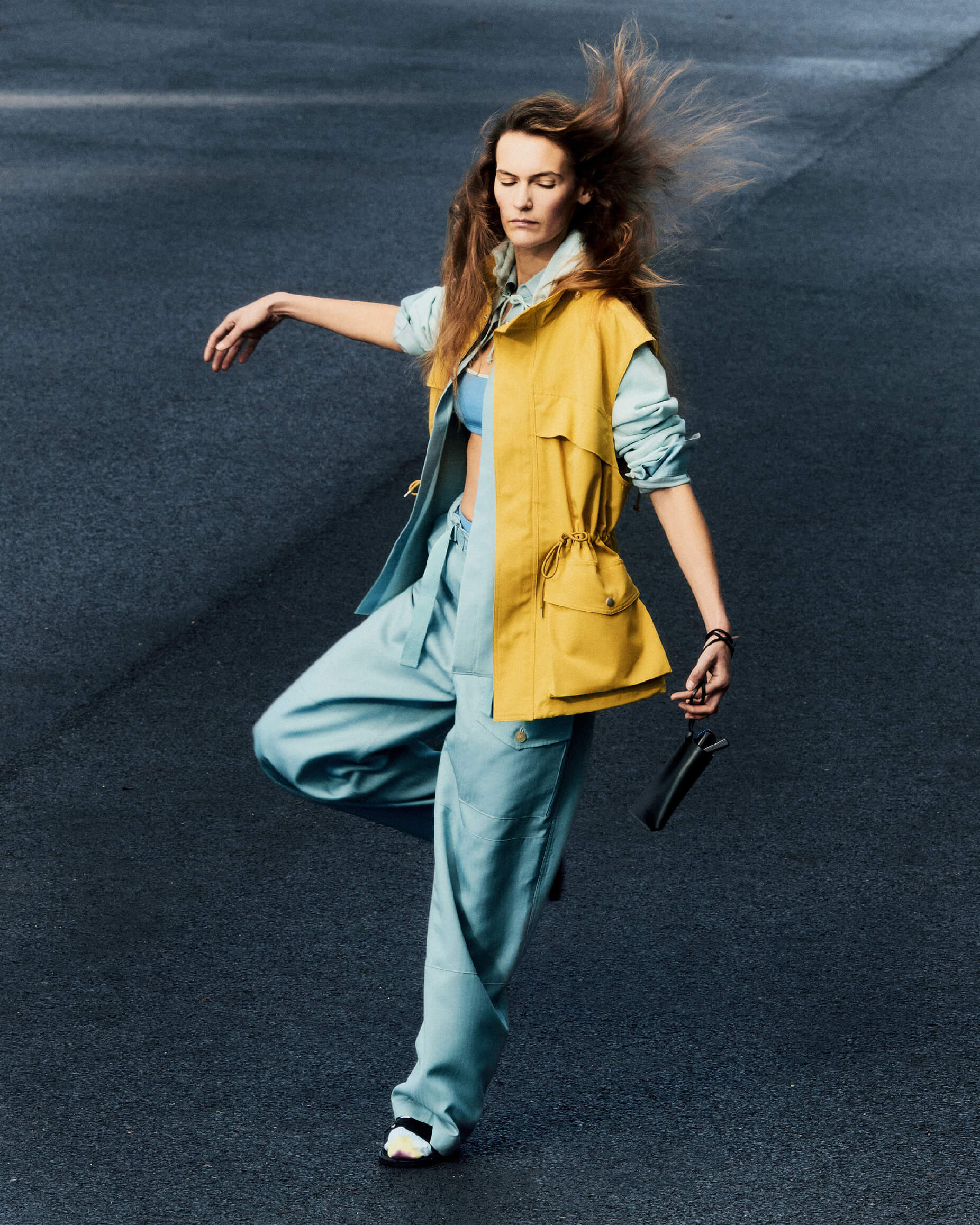 Fia wears Wool Max Canvas Over Vest in Mustard Yellow, Wool Herringbone Overshirt in Dusty Blue, Wool Herringbone Cargo Pants in Dusty Blue, Wool Stretch Double Jersey Set in Light Blue, Leather Sunglasses Case in Black