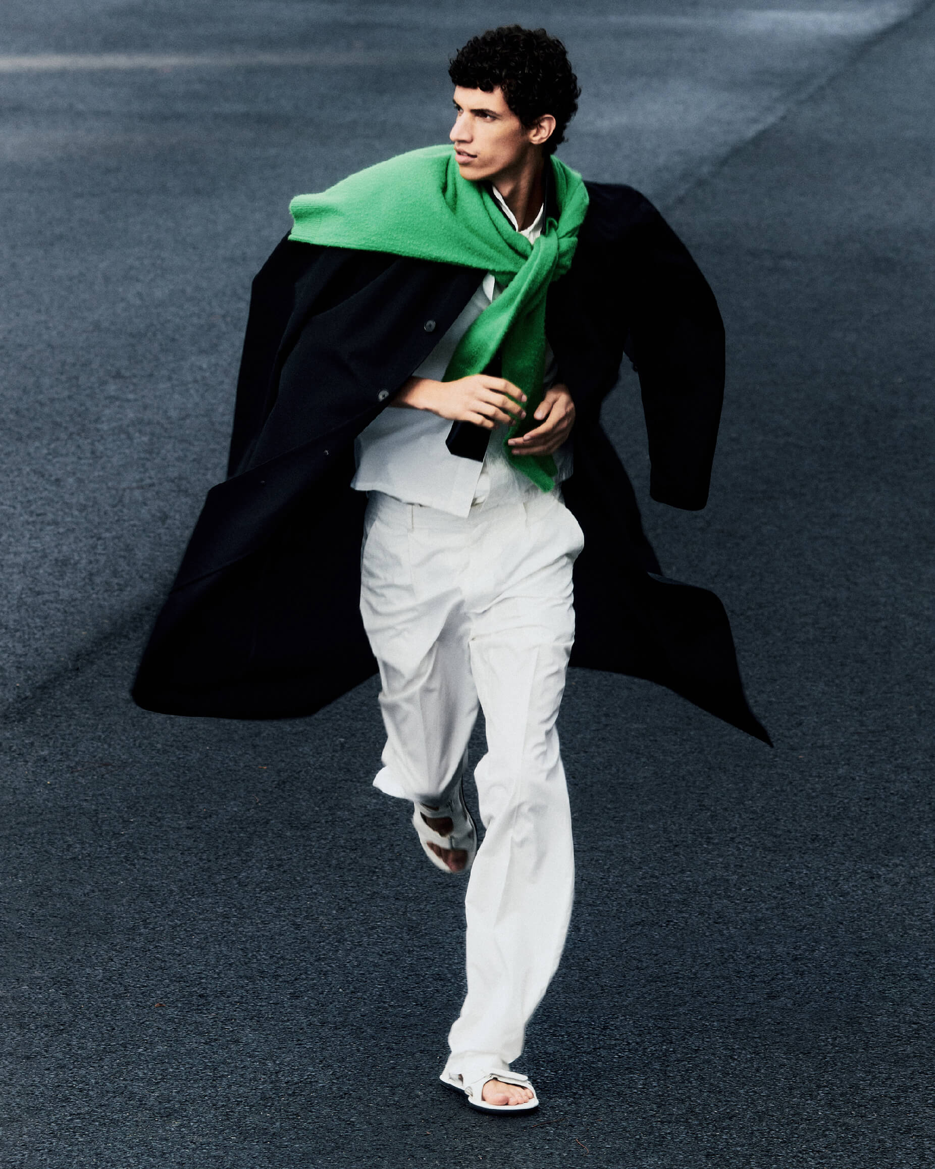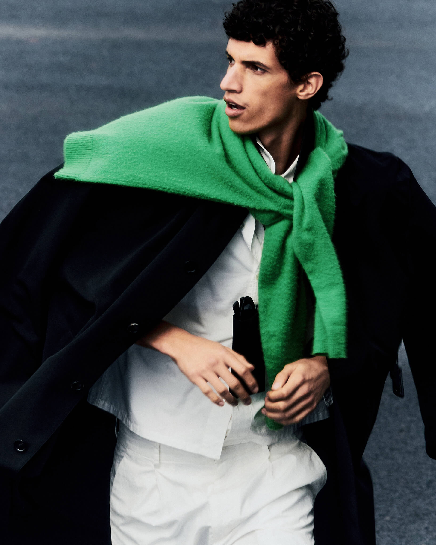 Nour wears Wool Max Canvas Coat in Black, Garment-Dyed Finx Shuttle Weather Shirt in White, Garment-Dyed Finx Shuttle Weather One-Tuck Slacks in White, Brushed Cashmere Cotton Knit P/O in Green, Leather Sunglasses Case in Black