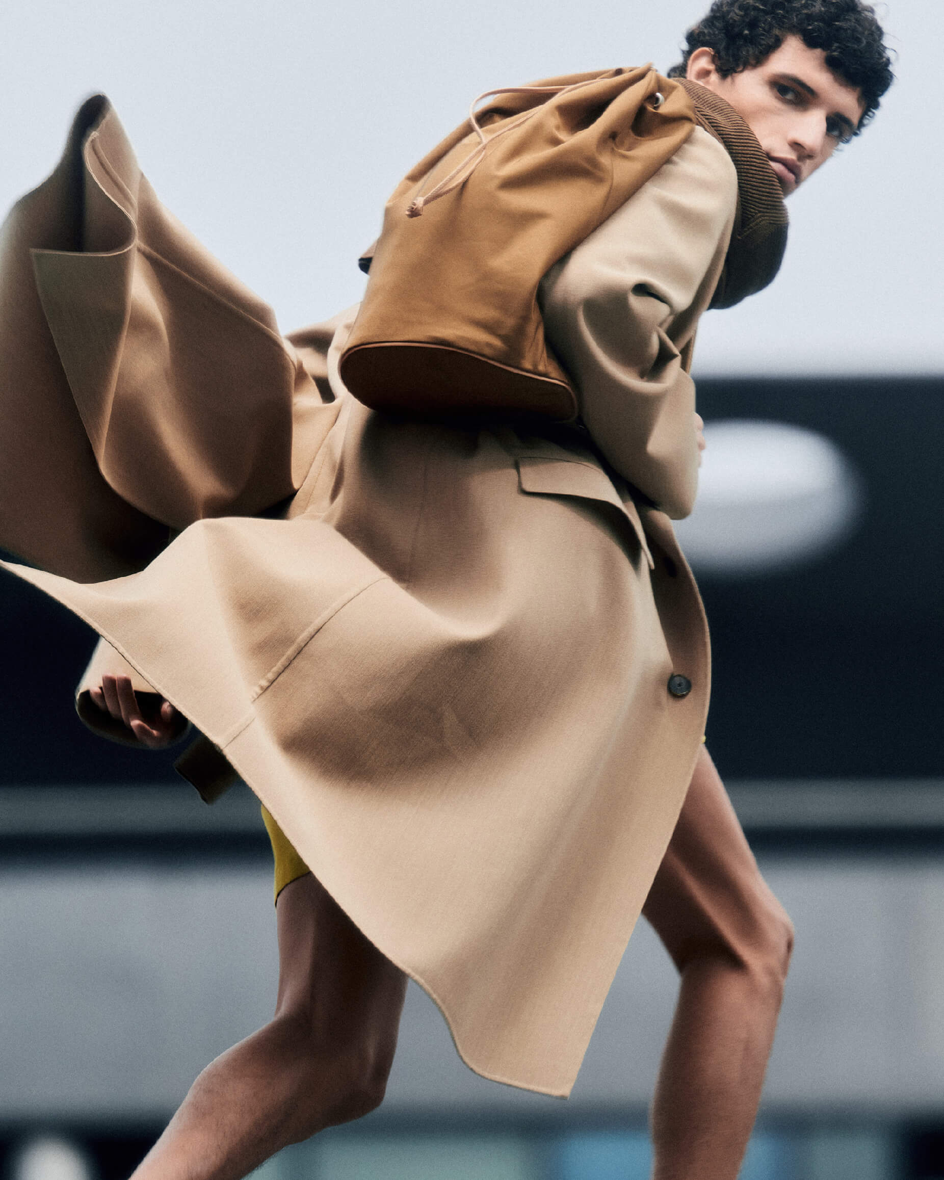Nour wears Structured Wool Gabardine Hand Sewn Coat in Brown Beige, Printed Airy Silk Half-Sleeved Shirt in Dark Brown, Wool Max Canvas Shorts In Mustard Yellow, Flat Yarn Rib Knit P/O in Light Brown, Cordura Nylon Shoulder Bag Made by Aeta in Camel