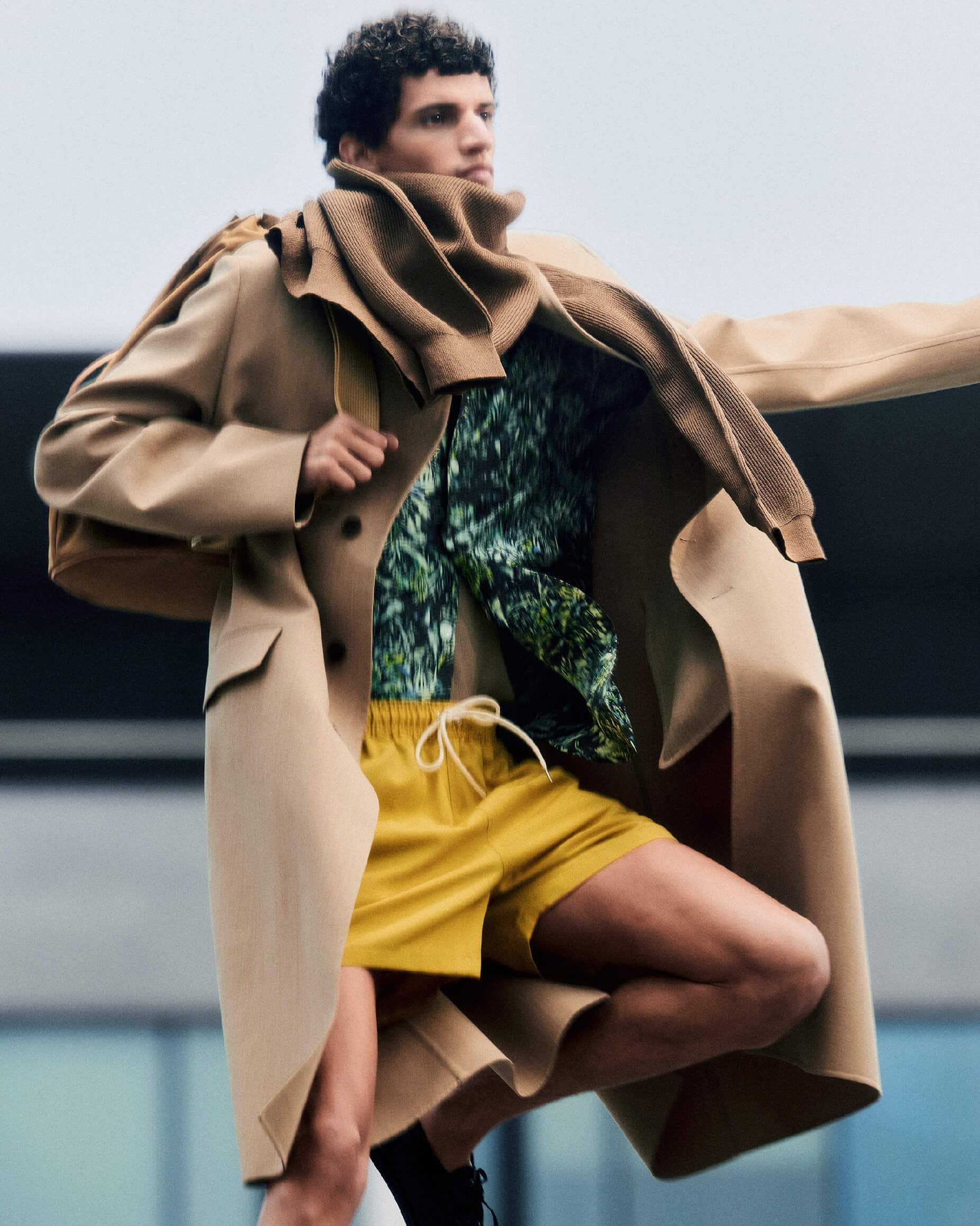 Nour wears Structured Wool Gabardine Hand Sewn Coat in Brown Beige, Printed Airy Silk Half-Sleeved Shirt in Dark Brown, Wool Max Canvas Shorts In Mustard Yellow, Flat Yarn Rib Knit P/O in Light Brown, Cordura Nylon Shoulder Bag Made by Aeta in Camel