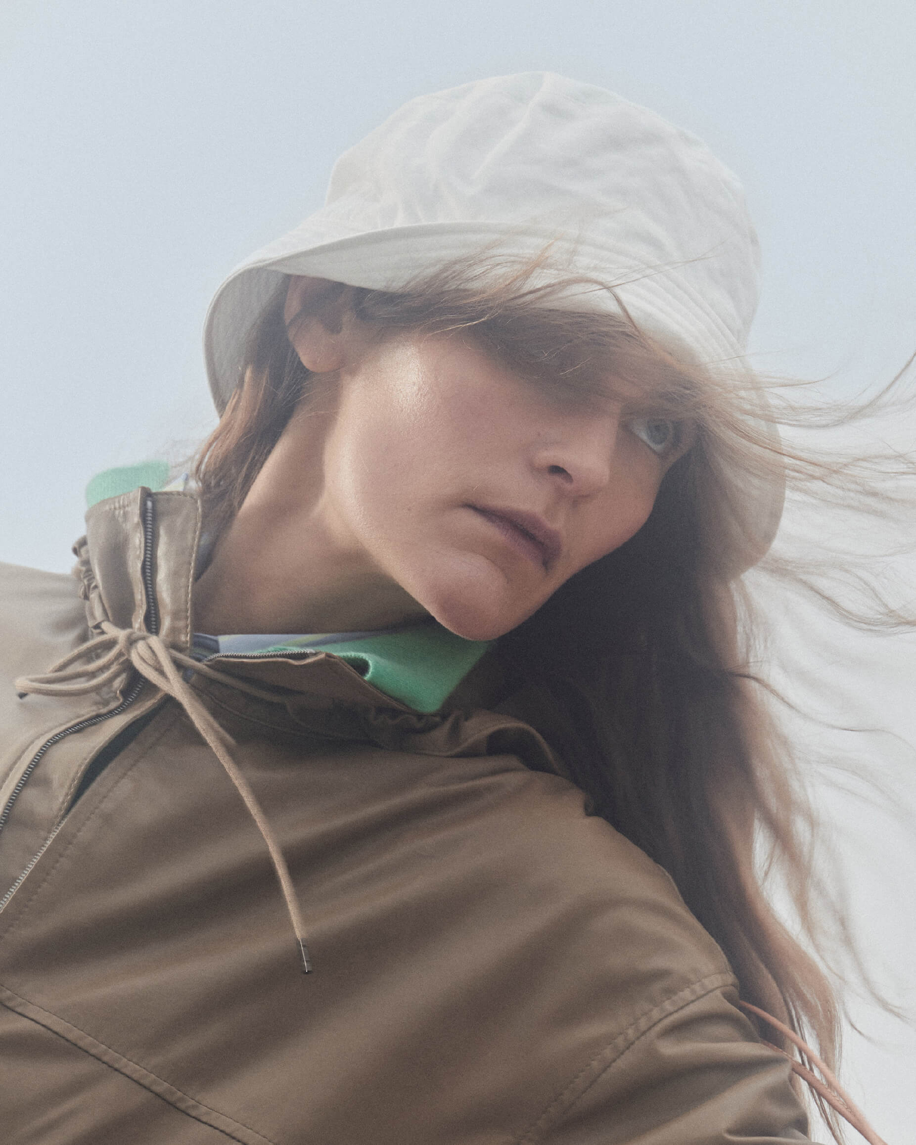 Fia wears Fine Baby Calf Hooded Blouson in Khaki Beige, Garment-Dyed Finx Chino Bucket Hat Made by Kijima Takayuki in White, Super Fine Cashmere Silk Knit Skipper Polo in Mint Green