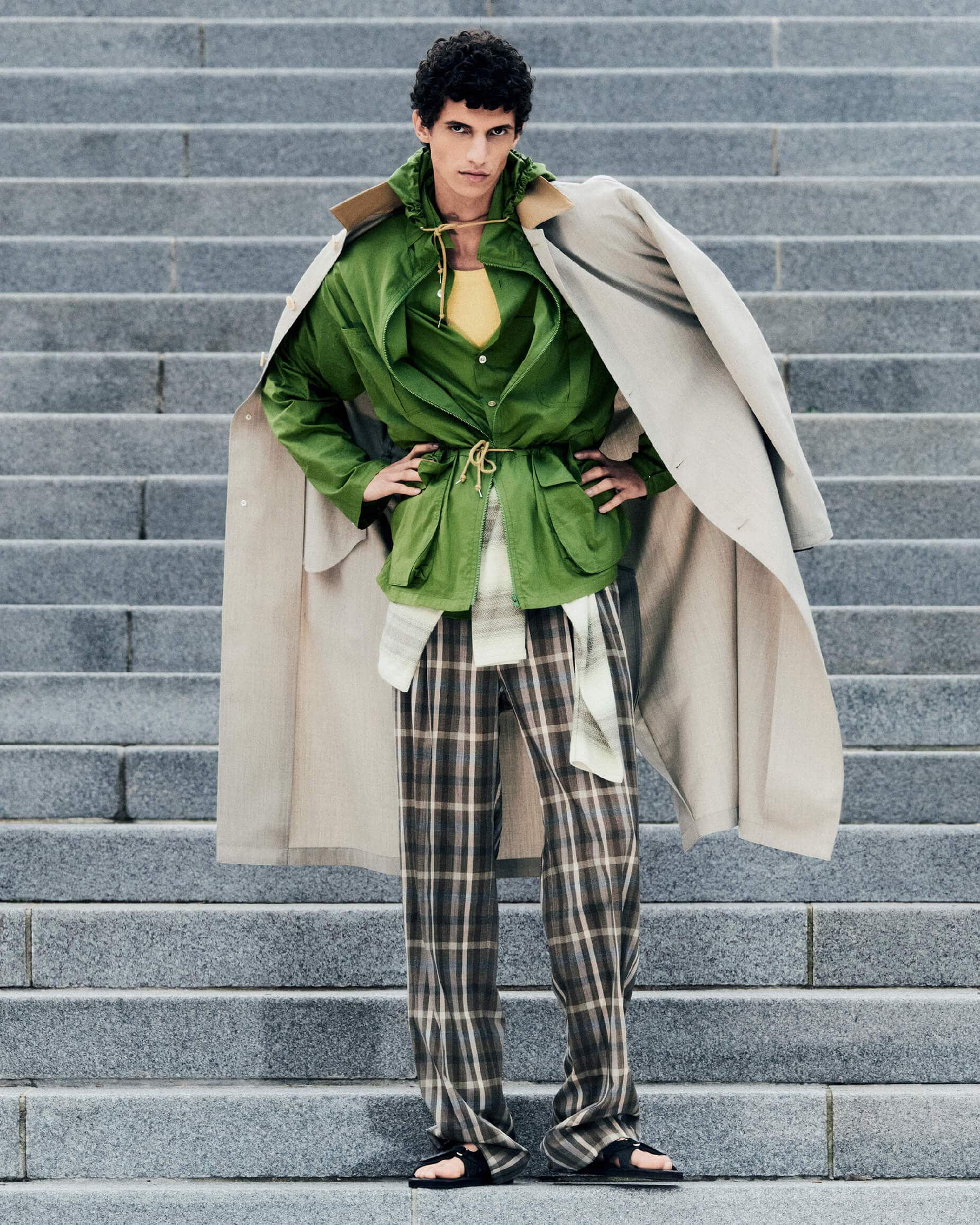 Nour wears Wool Max Canvas Coat in Top Gray Beige, Super Fine Cotton Lawn Hooded Blouson in Dusty Green, Super Fine Cotton Lawn Shirt in Dusty Green, Super Fine Tropical Wool Check Two-Tuck Slacks in Top Brown Check, Cotton Silk Gradient Stripe Knit Boat Neck P/O in Lime Gray Stripe, Organic Soft Rib Tank in Dusty Yellow, Soft Leather Double Strap Sandals in Black