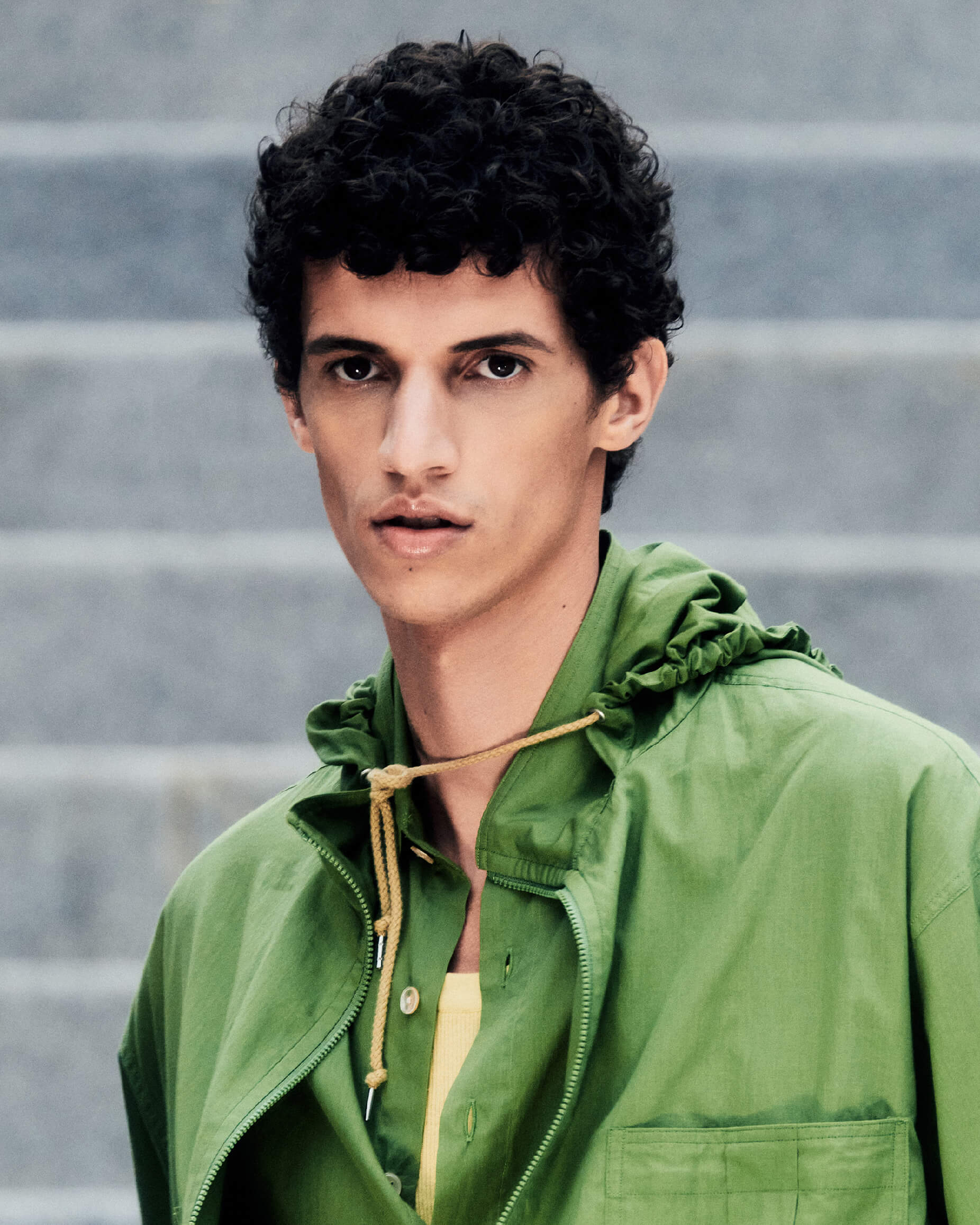 Fia wears Fine Baby Calf Hooded Blouson in Khaki Beige, Fine Baby Calf Gather Skirt in Khaki Beige, Super Fine Wool Stripe Shirt in Sax Blue Lime Stripe, Wool Stretch Double Jersey Tank in Lime Yellow, Super Fine Cashmere Silk Knit Skipper Polo in Mint Green, Cordura Nylon Small Shoulder Bag Made by Aeta in Lime Yellow, Soft Leather Flip-Flops in White