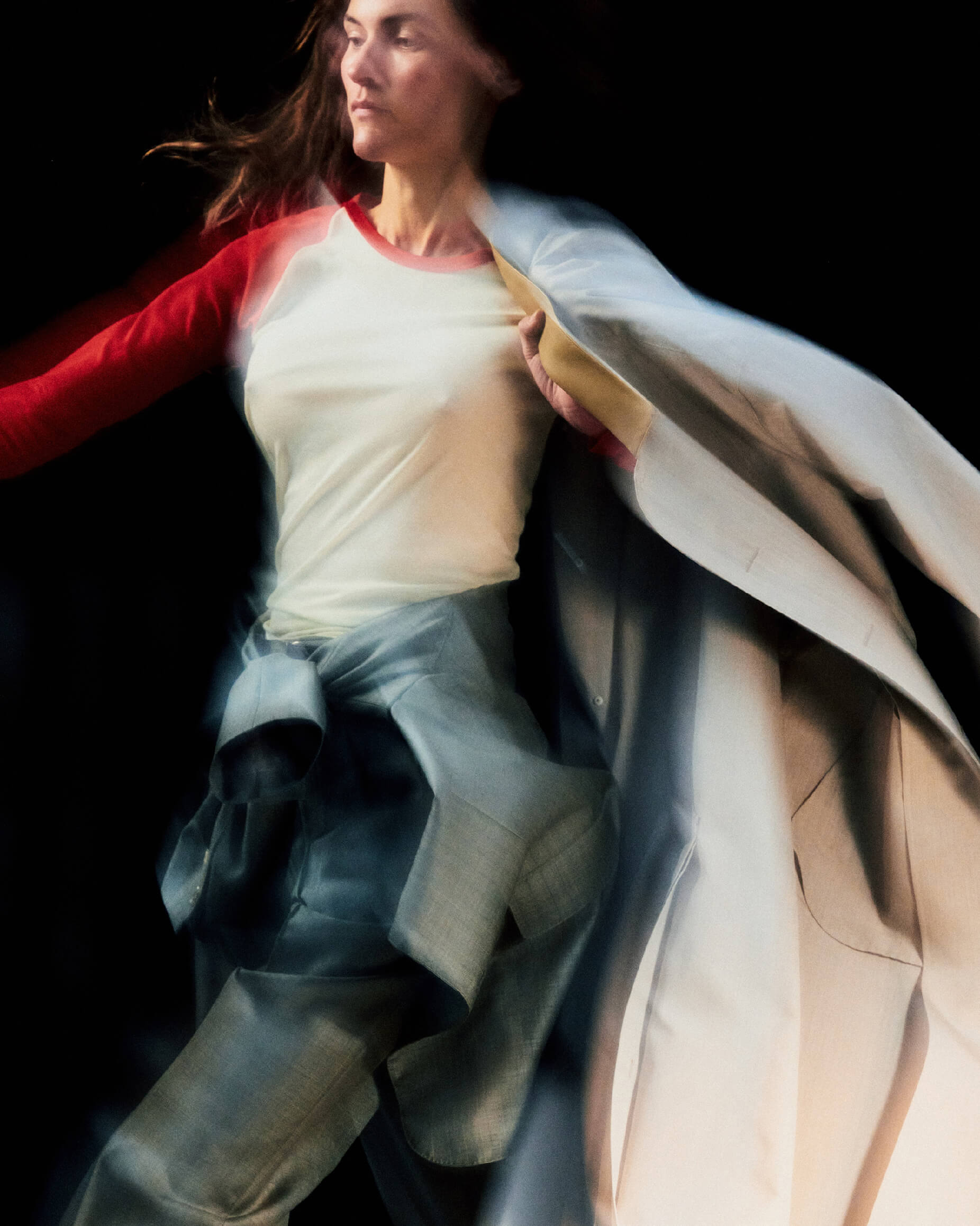 Fia wears Super High Gauge Sheer Rib Raglan P/O in Ivory x Red, Bluefaced Wool Jacket in Khaki Gray Stripe, Bluefaced Wool Two-Tuck Slacks in Khaki Gray Stripe, Wool Max Canvas Coat in Top Gray Beige