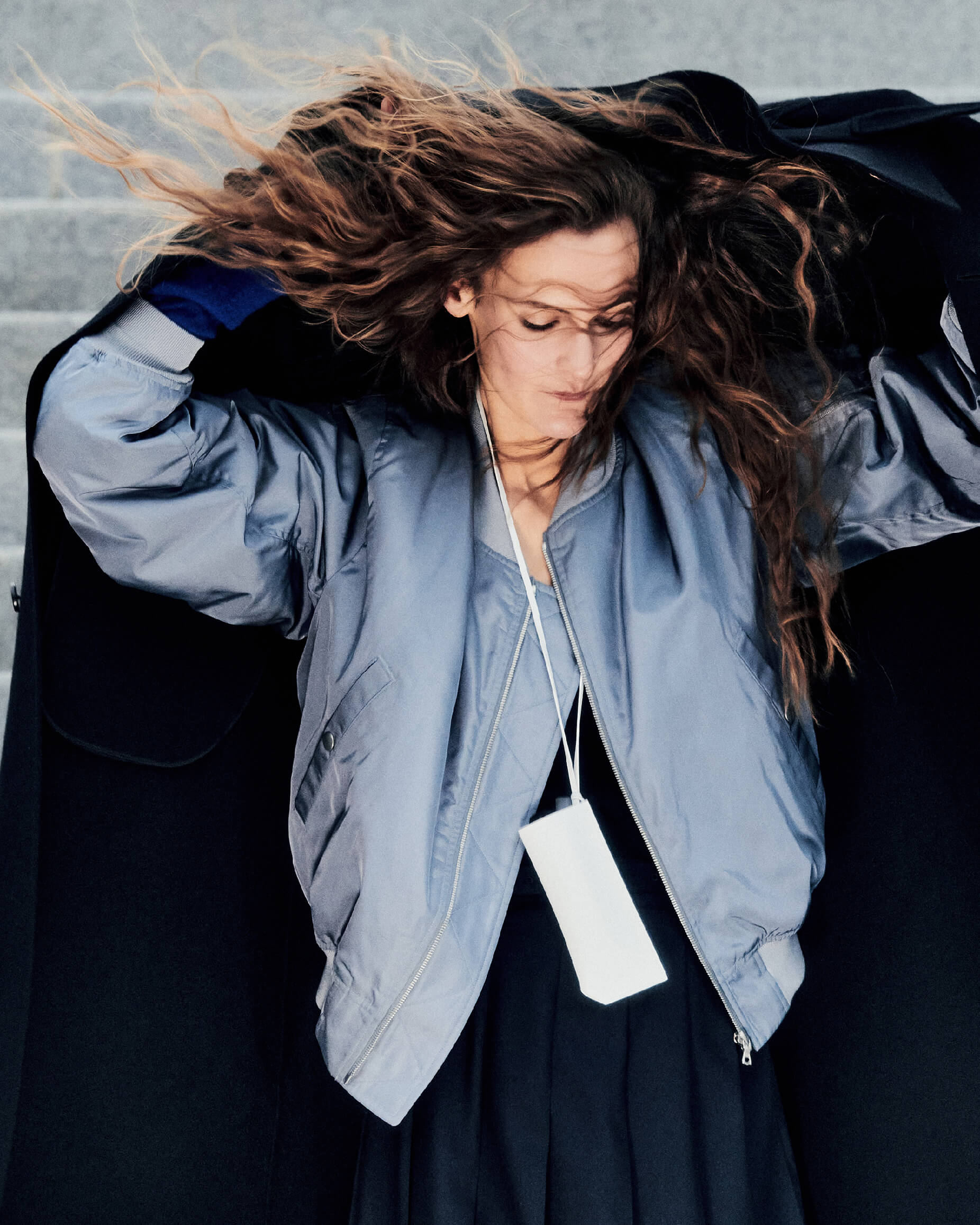 Fia wears Super Fine Wool Melton Hand Sewn Coat in Black, High Density Silk Twill Flight Blouson in Blue Gray, Wool Kid Mohair Hopsack Pleated Skirt in Dark Navy, Brushed Cashmere Cotton Knit Cardigan in Royal Blue, Leather Sunglasses Case in White, Cotton Cashmere Low Gauge Socks in Top Charcoal, Soft Leather Double Strap Sandals in Black
