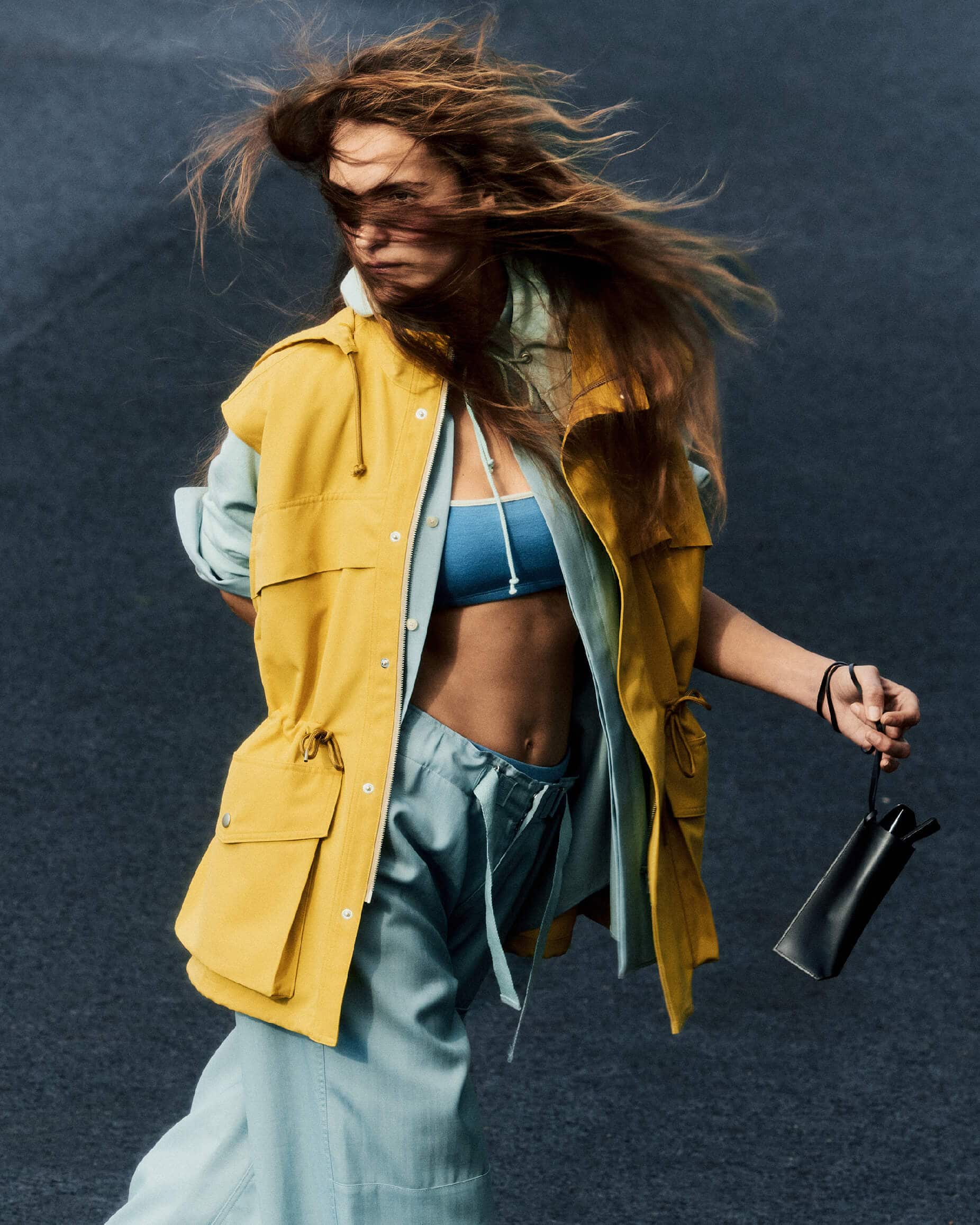 Fia wears Wool Max Canvas Over Vest in Mustard Yellow, Wool Herringbone Overshirt in Dusty Blue, Wool Herringbone Cargo Pants in Dusty Blue, Wool Stretch Double Jersey Set in Light Blue, Leather Sunglasses Case in Black